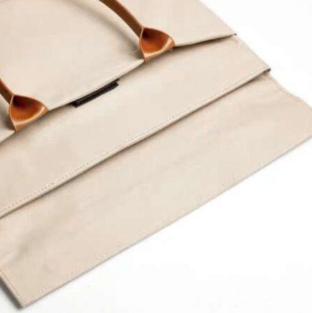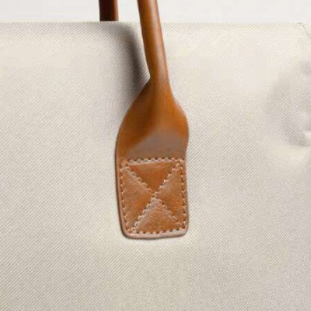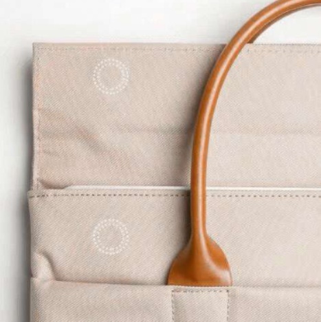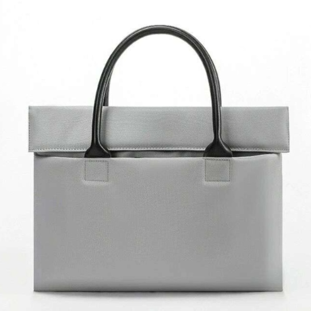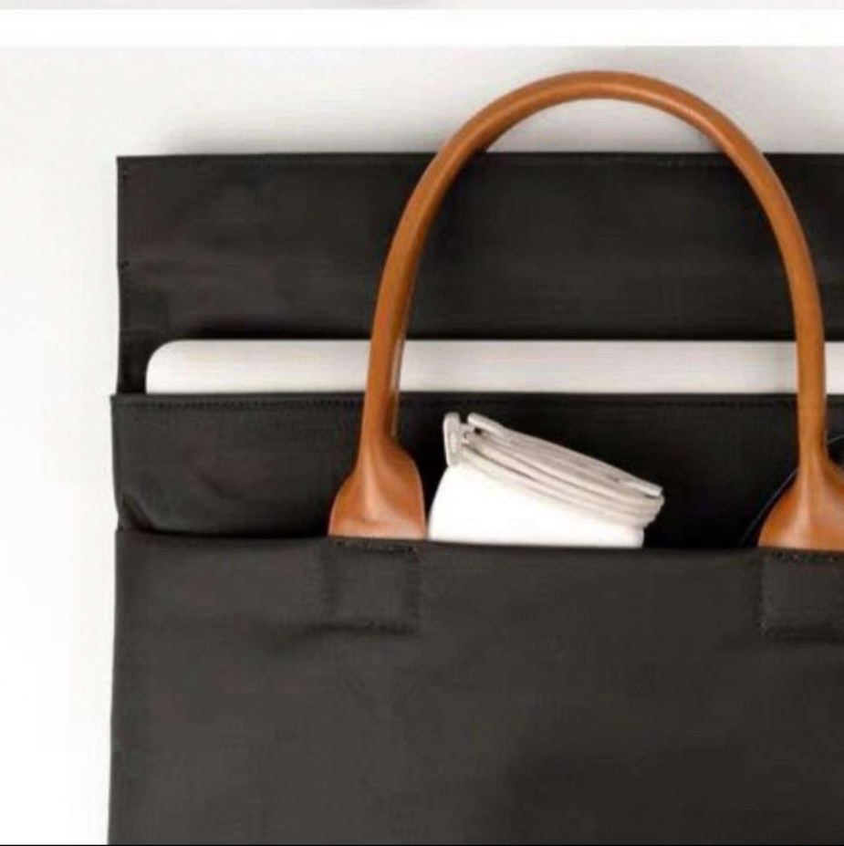 本革調の持ち手が全体の印象を引き締め、ビジネスシーンでも違和感なく使える上品さを演出しています。