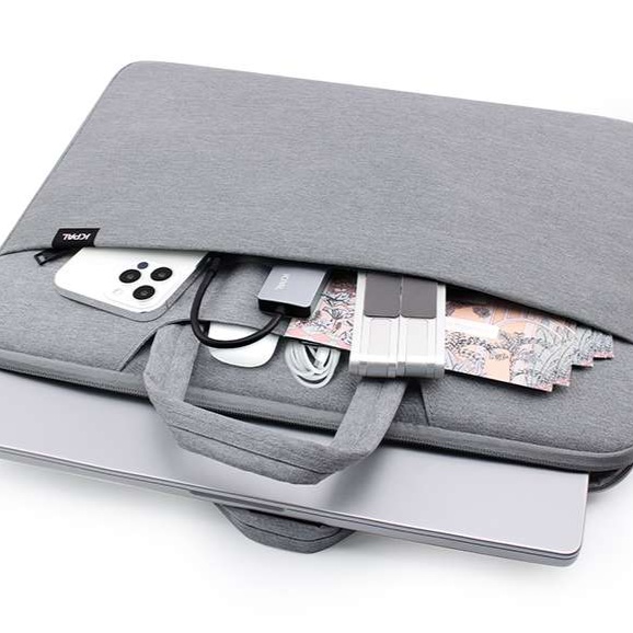14インチパソコン用の多層構造ケース。大容量で耐衝撃性に優れ、充電器やスマートフォンなどの小物も整理して収納可能。