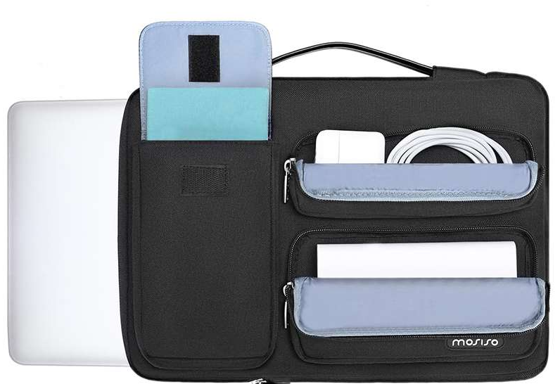 前面に配置された複数のポケットにより、充電器やケーブルなどの小物もすっきりと整理できます。