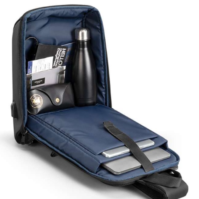 14インチまでのパソコンを収納できる機能的なパソコンケース。片掛けで持ち運べる斜めがけタイプで、外部充電ポート付きの便利な設計。