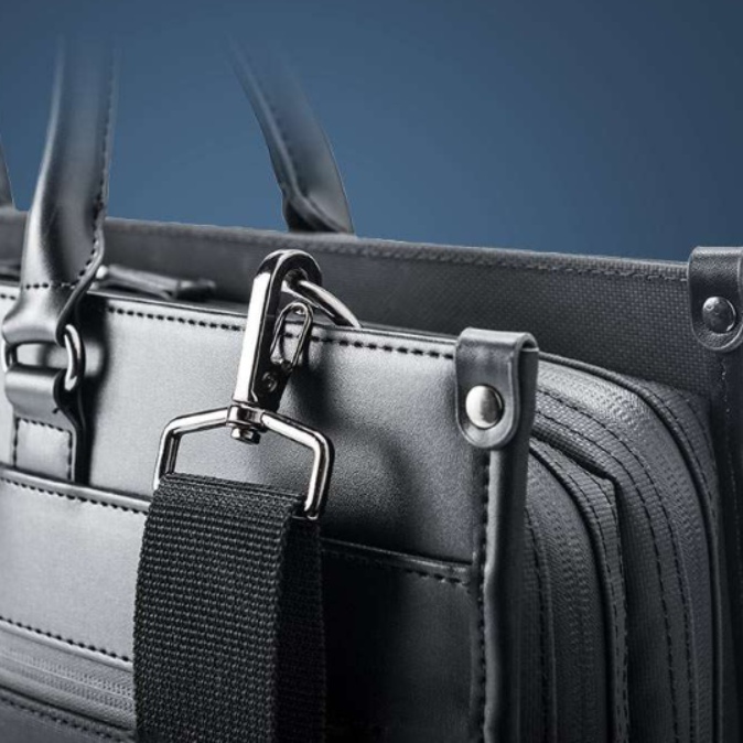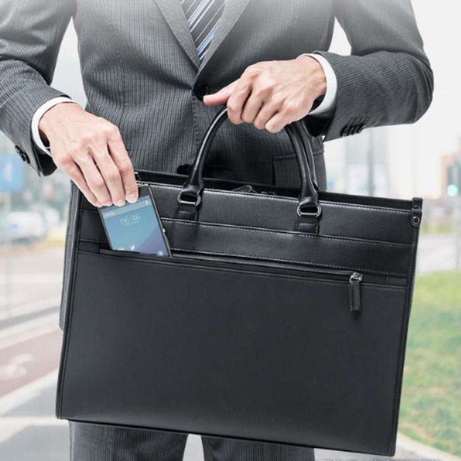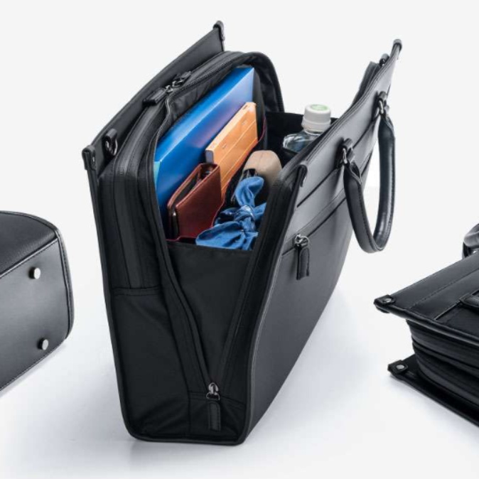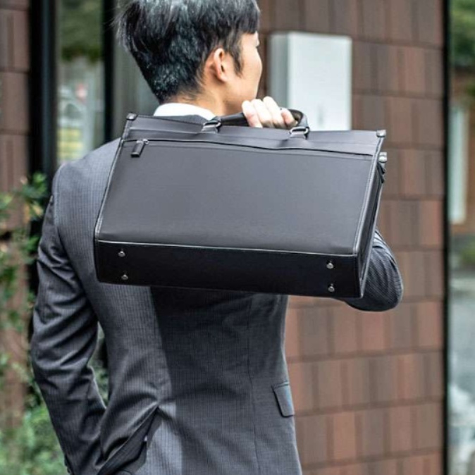 ビジネスシーンに映える洗練されたデザインで、肩掛けストラップ付きで持ち運びも快適。