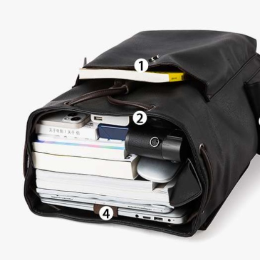 ノートパソコンや本、スマートフォンなど、様々なアイテムを整理して収納できる実用的な内装設計。