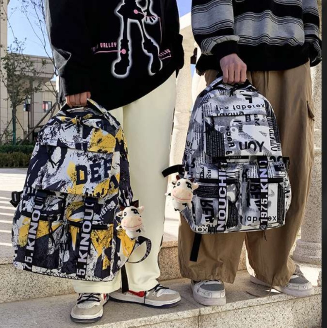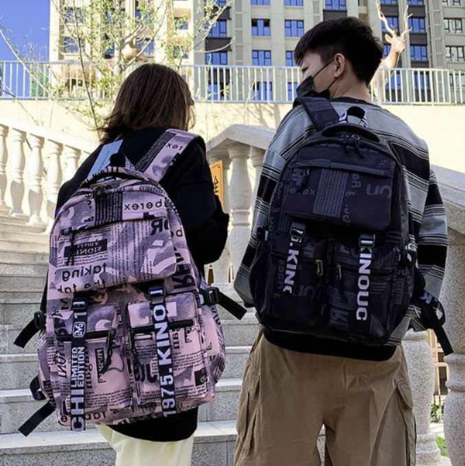 新聞や雑誌の切り抜きをコラージュしたようなデザインが特徴的なパソコンリュック。