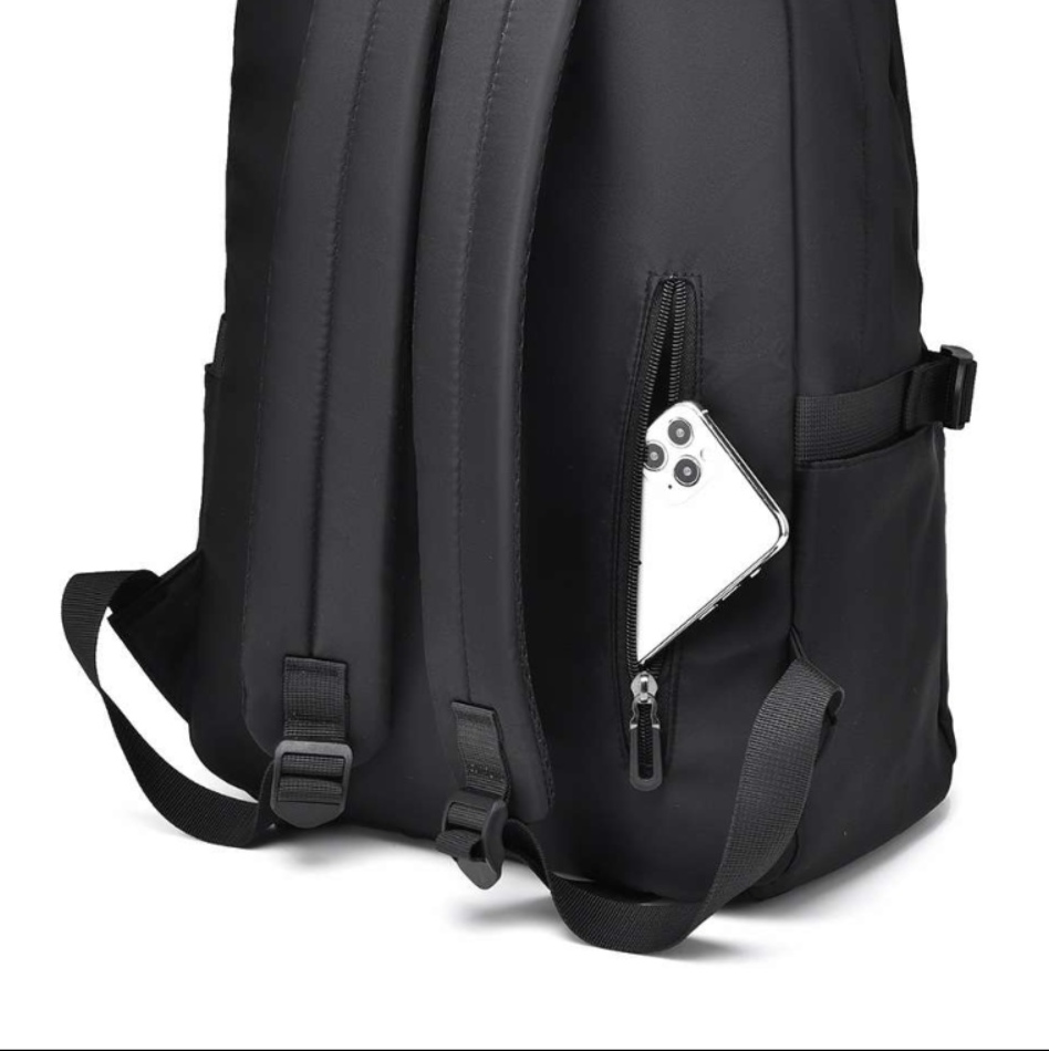 背面にファスナー付きの収納があり、スマートフォンなど貴重品の持ち運びに安心感があります。