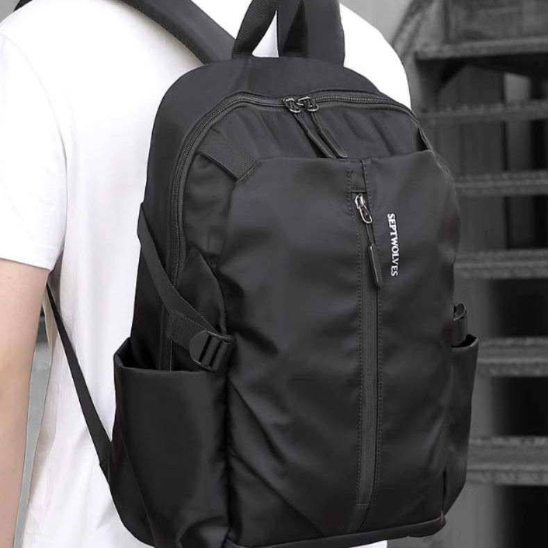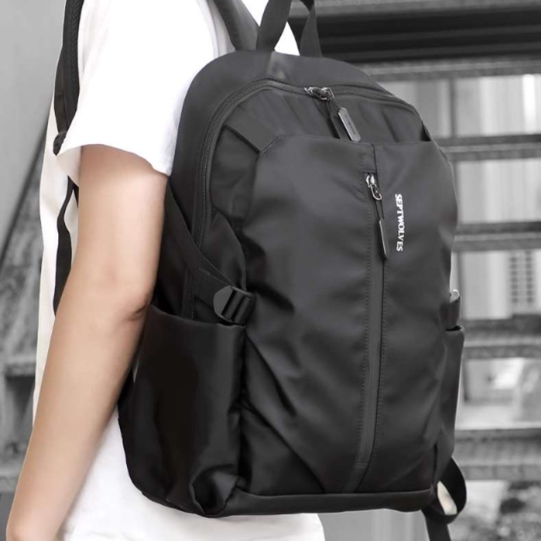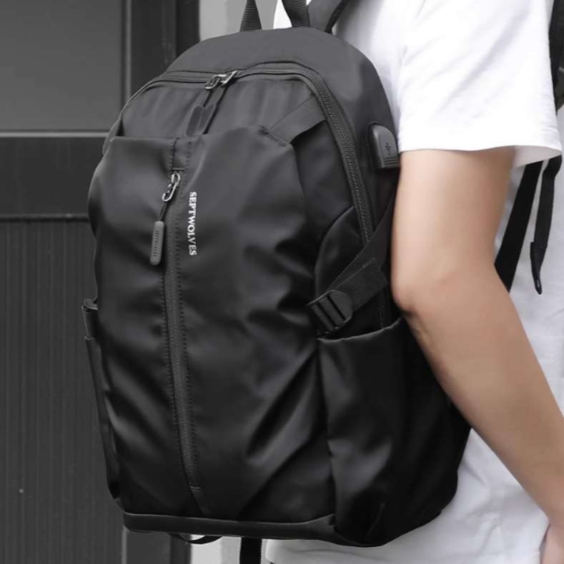 耐久性と防水性に優れたリュックで、充電ポート搭載の実用的デザイン。