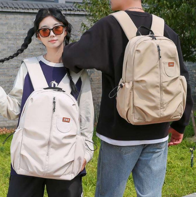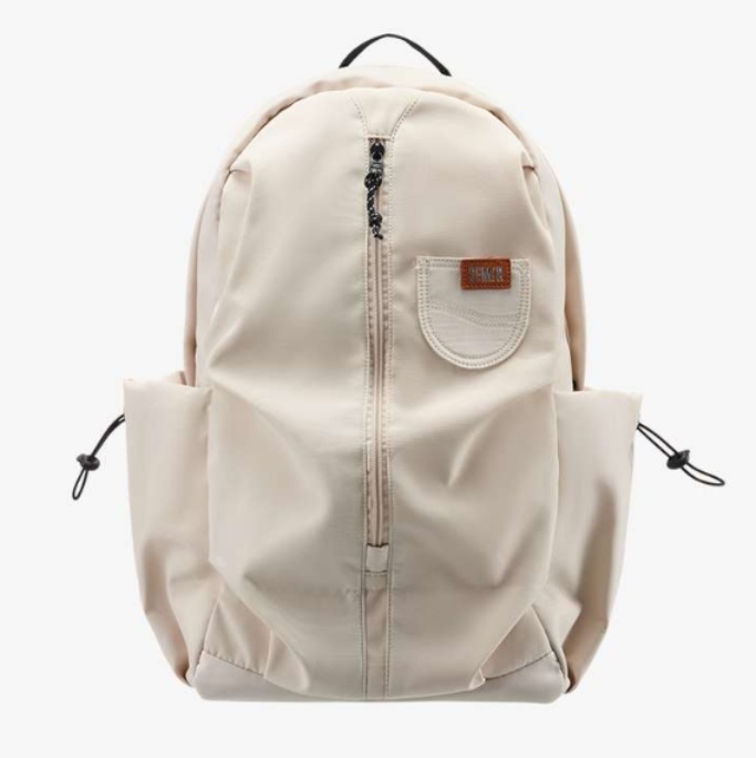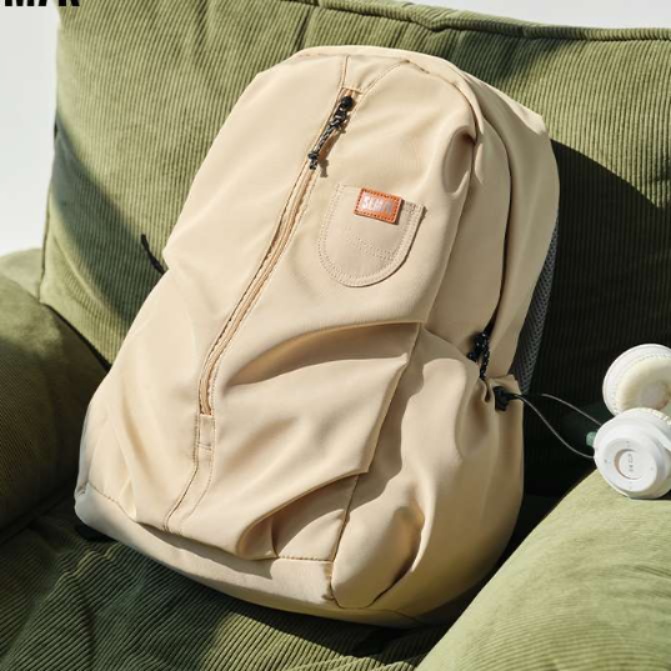 斜めジッパーや小物入れを備えた大容量リュックで、日常使いからアウトドアまで幅広く活躍する実用的な一品。