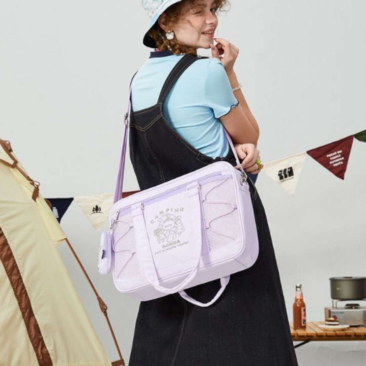 キャンプ気分を味わえる可愛いデザインのパソコンケース。 フラッグやキャンプ道具のイラストが施された機能的なトートバッグタイプのパソコンバッグ。 大容量設計のPCバッグで、かわいさと実用性を兼ね備えた一品。 サイドポケットや収納スペースも充実しており、アウトドア好きにおすすめのパソコンバッグです。