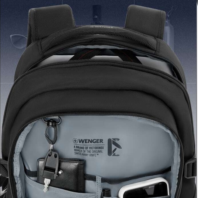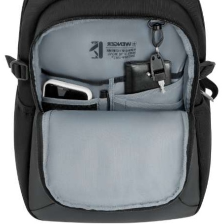 内部に仕切りが充実しており、パソコンやタブレット、文具類などを効率的に整理できる設計です。