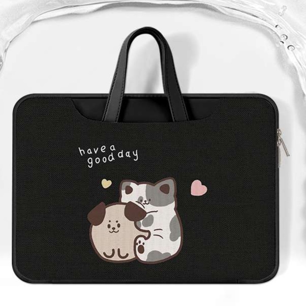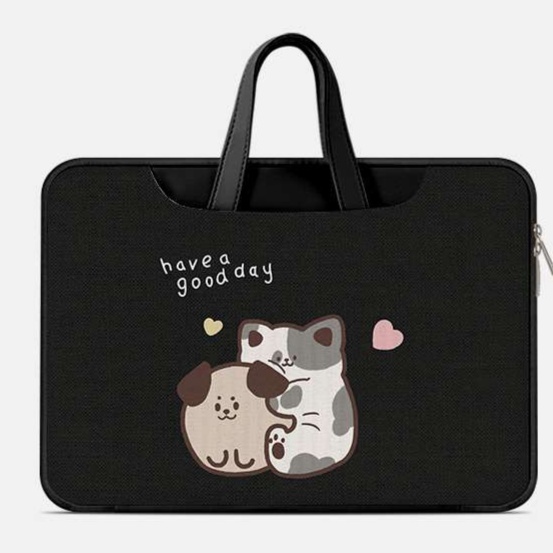可愛い犬と猫のイラストが描かれた心温まるパソコンケースです。